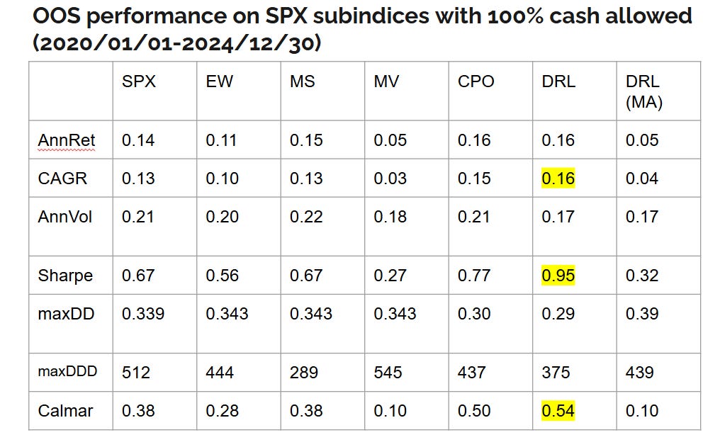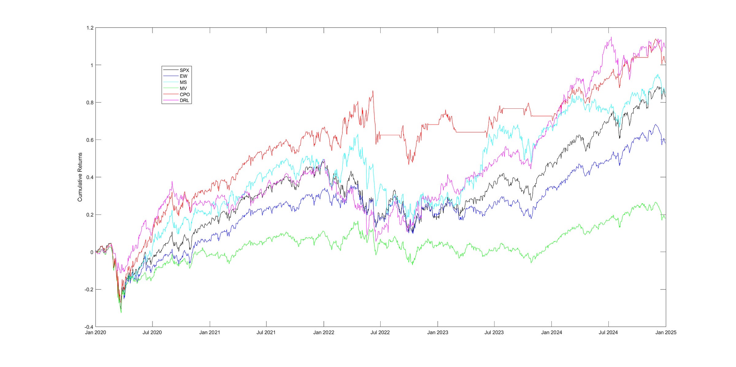 Ernie’s team at Predictnow.ai implemented this DRL strategy, and compare that with other conventional portfolio optimization methods, including PredictNow.ai's proprietary Conditional Portfolio Optimization (CPO) method (Ref. [7]), which is far simpler than DRL. Here are the results: